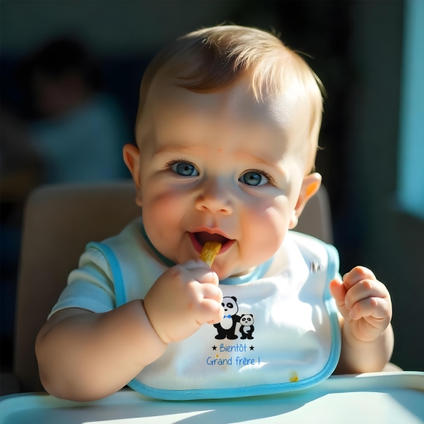 À la recherche d'une façon unique d'annoncer une grande nouvelle ? Optez pour ce bavoir personnalisé spécialement conçu pour annoncer une grossesse ! Avec des options de texte comme "Bientôt grand frère" ou tout autre message de votre choix, ce bavoir est le moyen parfait de surprendre vos proches.