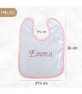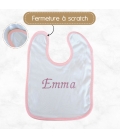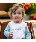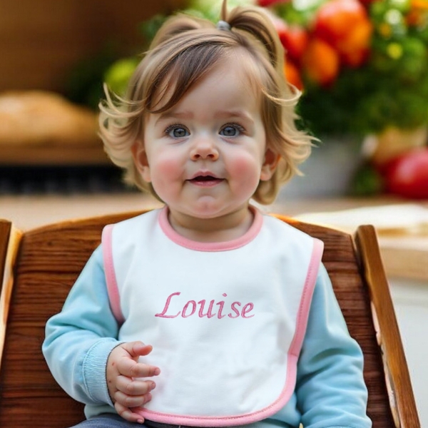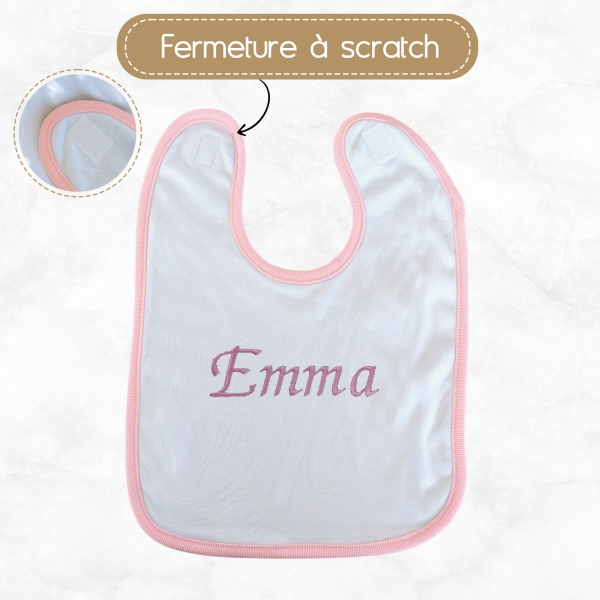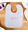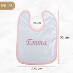 Offrez un bavoir personnalisé en broderie, conçu pour ajouter une touche unique et adorable aux repas de bébé. Avec son liseré rose et la possibilité de broder le prénom dans différentes couleurs, ce bavoir est l'idée cadeau parfaite.