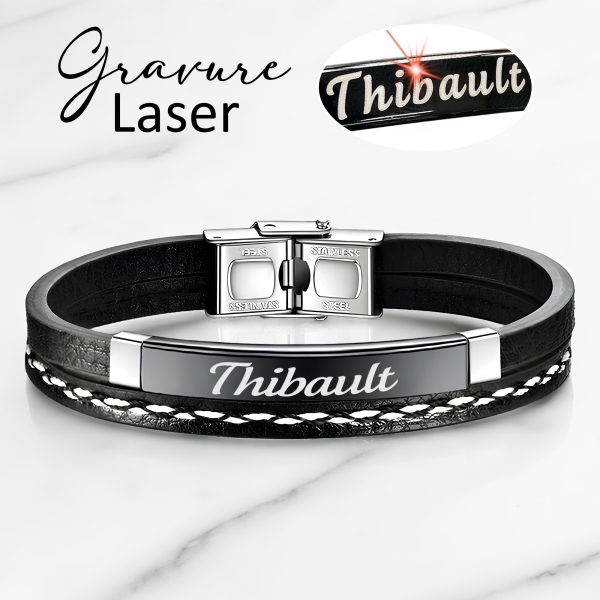 MATIÈRE : Ce bracelet est en acier inoxydable. L'avantage de l'acier inoxydable réside dans sa durabilité, sa résistance à la corrosion, sa facilité d'entretien et son aspect esthétique moderne. Il est composé d’une plaque personnalisable et d’un bracelet noir en simili cuir pour une résistance à toute épreuve.