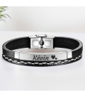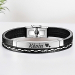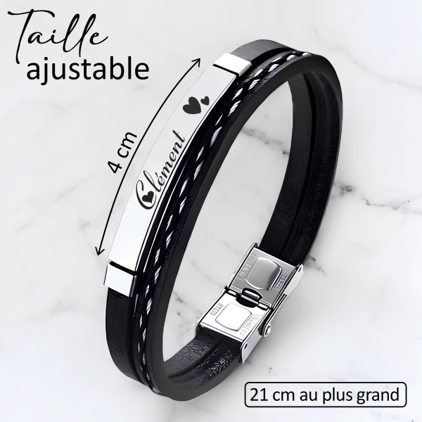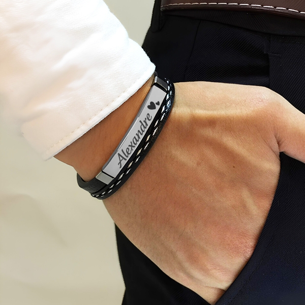Distinguez-vous avec élégance grâce à notre bracelet personnalisé pour homme. Fait de simili cuir et d'acier inoxydable de haute qualité, ce bracelet arbore une plaque argentée que vous pouvez graver selon vos envies : un prénom, une date, des initiales ou un surnom, accompagné de petits cœurs. Un accessoire intemporel qui allie style et sentiment, parfait pour un cadeau !