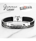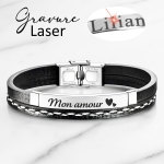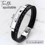 MATIÈRE : Ce bracelet est en acier inoxydable. L'avantage de l'acier inoxydable réside dans sa durabilité, sa résistance à la corrosion, sa facilité d'entretien et son aspect esthétique moderne. Il est composé d’une plaque personnalisable et d’un bracelet noir en simili cuir pour une résistance à toute épreuve.
