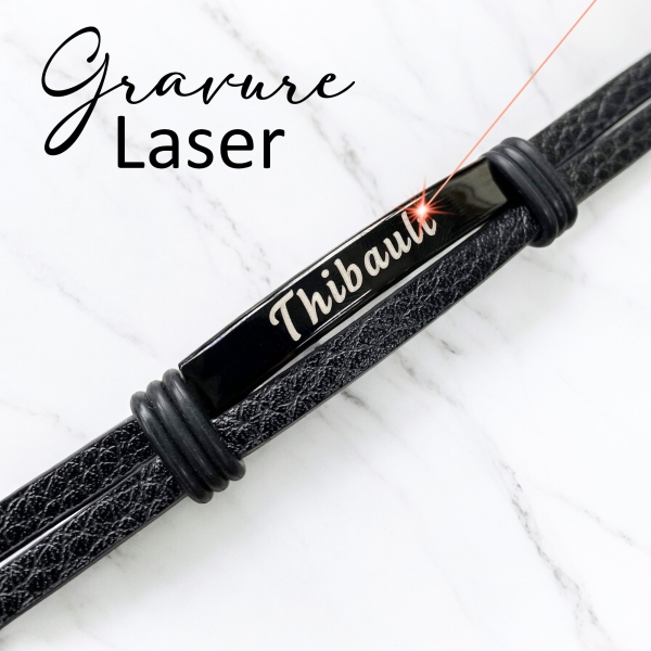 MATIÈRE : Ce bracelet est en acier inoxydable. L'avantage de l'acier inoxydable réside dans sa durabilité, sa résistance à la corrosion, sa facilité d'entretien et son aspect esthétique moderne. Il est composé d’une plaque personnalisable et d’un bracelet noir en simili cuir pour une résistance à toute épreuve.