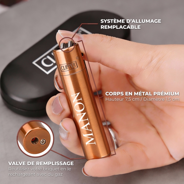 Briquet de la marque clipper à graver avec votre propre texte. Vous pourrez inscrire par exemple une date, un prénom ou des initiales. L'étui en métal est inclus avec.