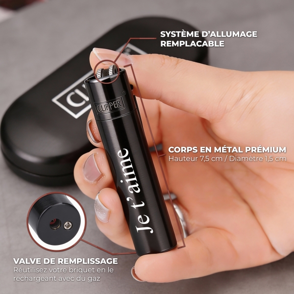 Découvrez notre briquet Clipper personnalisé de couleur noir, gravé pour une touche unique. Idée cadeau parfaite, ce briquet Clipper allie fonctionnalité et personnalisation. Vous pouvez y inscrire une date, un prénom ou des initiales. Offrez un accessoire pratique et distinctif avec ce briquet Clipper gravé, idéal pour toutes les occasions.