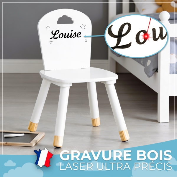 Publié le 17/12/2023 à 16:33 (Date de commande : 26/09/2023)5Très belle chaise et gravure parfaite . Je recommande vivement ces petites chaises personnalisées .
