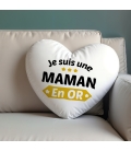Coussin coeur avec le logo "Je suis une Maman en or " à personnaliser avec le prénom que vous souhaitez. Le cadeau idéal pour faire plaisir à sa maman lors de la fête des mères, son anniversaire ou pour Noël.