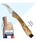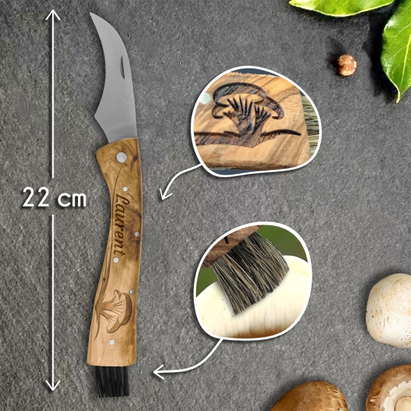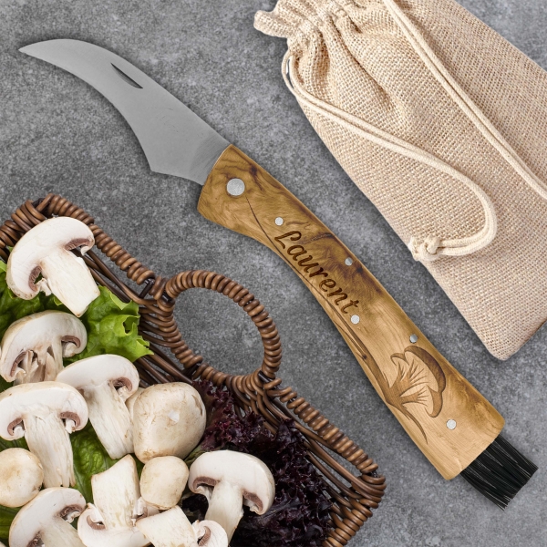 Couteau à champignon manche en bois marron à personnaliser avec le prénom de votre choix et lame en acier inoxydable. Cadeau idéal pour les amoureux de promenades en forêt. Couteau équipé d'une brosse pratique pour nettoyer vos trouvailles !