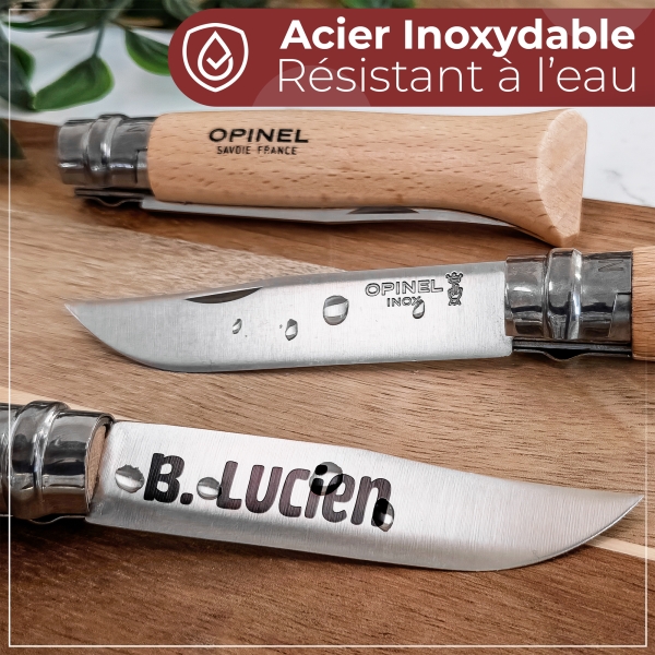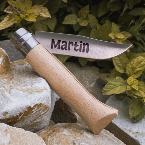 Couteau de la marque Opinel n°8 avec lame en acier inoxydable à personnaliser avec le message de votre choix ! Un cadeau personnalisé avec un prénom.