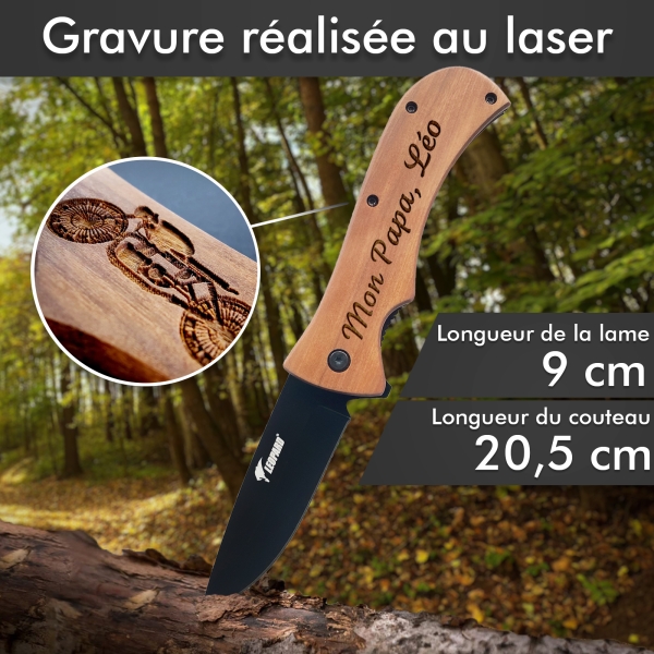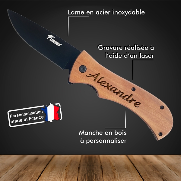 Magnifique couteau à personnaliser parmi nos modèles de la marque Léopard. Couteau au design sobre et classe grâce à sa lame noire et son manche personnalisable en bois ! Un cadeau parfait pour tous les types d'événements, anniversaire, fête des pères, Noël. À offrir aux amoureux de la nature, chasse ou pêche.