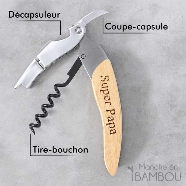 PERSONNALISATION : Le manche en bambou du tire-bouchon est personnalisable avec le texte de votre choix. Avec votre prénom d’inscrit sur celui-ci, vous obtiendrez un cadeau unique et original pour la fête des pères. Nous réalisons votre cadeau personnalisé dans notre atelier en France en 24h !
