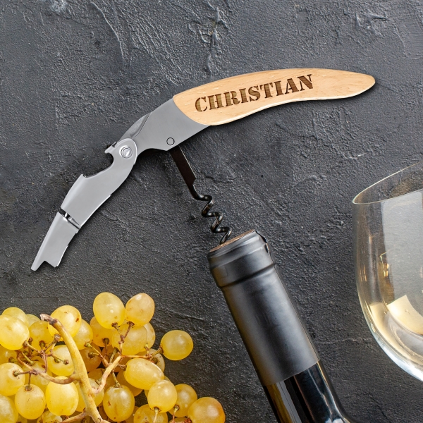 Personnalisez le manche en bois de ce tire-bouchon sommelier avec le texte de votre choix. Il présente 3 fonctions : tire-bouchon, décapsuleur et coupe-capsule. C'est un cadeau unique pour tout amateur de vin et le cadeau parfait pour les connaisseurs. Il deviendra le compagnon indispensable pour toute dégustation de vin !
