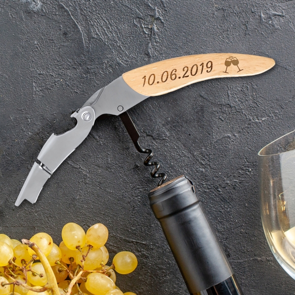 Personnalisez le manche en bois de ce tire-bouchon sommelier modèle vin avec le texte de votre choix. Il présente 3 fonctions : tire-bouchon, décapsuleur et coupe-capsule. C'est un cadeau unique pour tout amateur de vin et le cadeau parfait pour les connaisseurs et pour la fête des pères. Il deviendra le compagnon indispensable pour toute dégustation de vin !