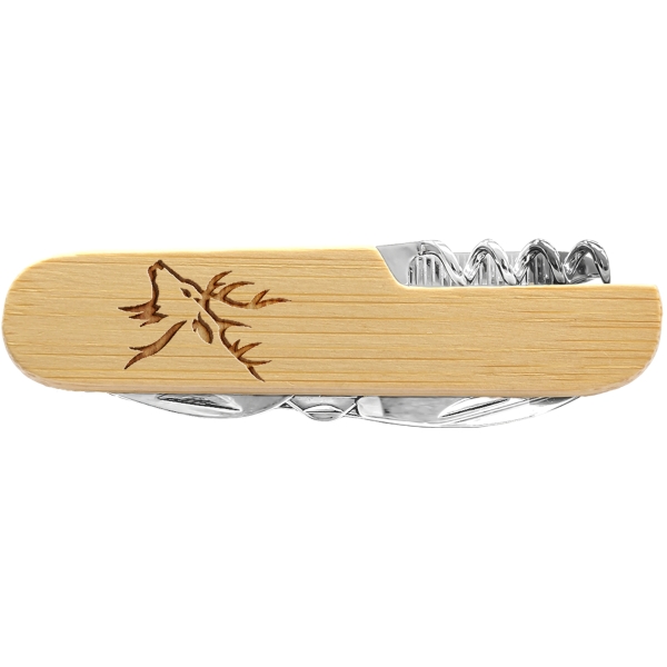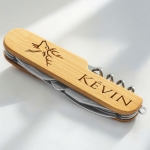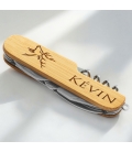 Couteau suisse multifonction en bambou personnalisable avec un logo d'un cerf et un prénom ! Cadeau idéal pour les amoureux de la nature. Une gravure réalisée avec un laser dans notre atelier en France.