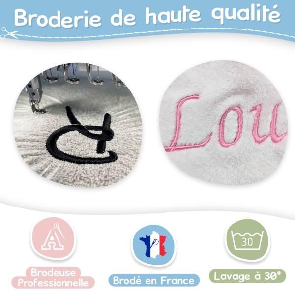 BRODERIE : Réalisée à l'aide d'une brodeuse professionnelle, vous obtiendrez une personnalisation de qualité qui ne bougera pas dans le temps.
