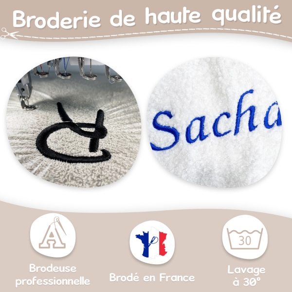 BRODERIE : Réalisée à l'aide d'une brodeuse professionnelle, vous obtiendrez une personnalisation de qualité qui ne bougera pas dans le temps.