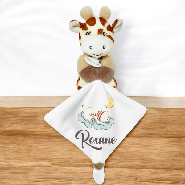 Découvrez notre doudou girafe personnalisé, conçu pour apporter réconfort et tendresse à votre enfant. Unique grâce à la personnalisation, ce doudou deviendra son compagnon de jeu et de sommeil favori. Avec son long cou et sa douceur infinie, la girafe est idéale pour les petits aventuriers.