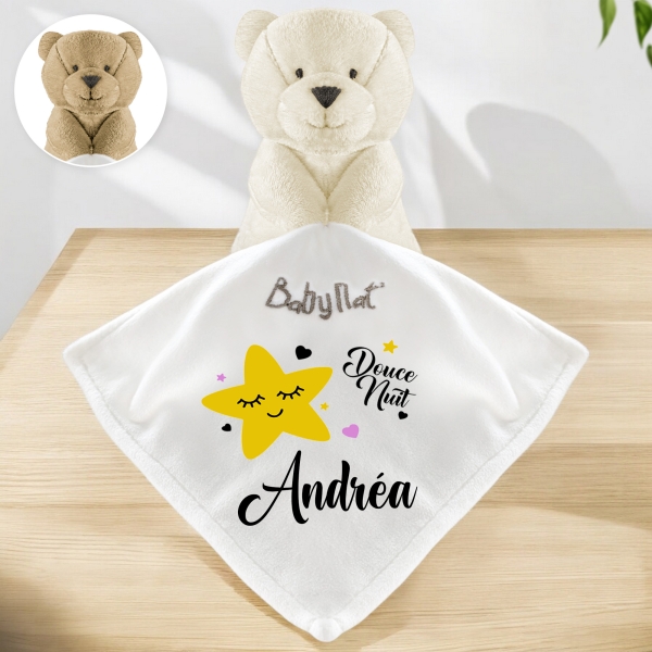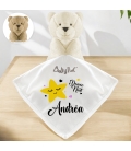 Découvrez ce doudou ourson de couleur blanc ou marron à personnaliser avec le prénom que vous souhaitez. Il deviendra rapidement le compagnon indispensable de bébé lors de sa sieste et pour l'heure du coucher. C'est l'assurance d'un cadeau vraiment original et réussi pour une occasion telles qu'une naissance, un baptême ou un anniversaire.