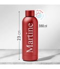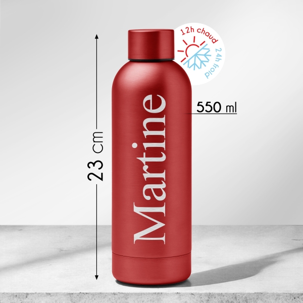 Cette gourde personnalisée avec le prénom de votre choix est le cadeau parfait, à la fois unique et mémorable. Grâce à une gravure réalisée avec un laser professionnel directement sur l'acier inoxydable, votre personnalisation restera intacte au fil du temps. 23 cm de hauteur et 7,4 cm de diamètre, cette gourde a une capacité de 550 ml, idéale pour garder vos boissons à portée de main.