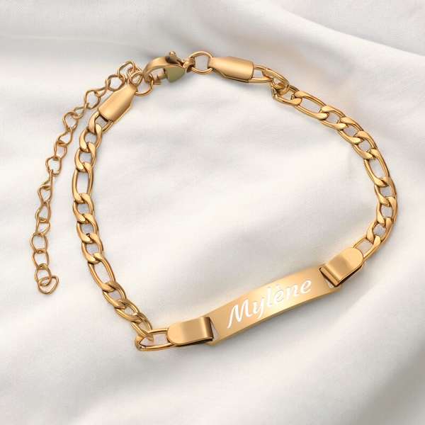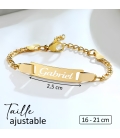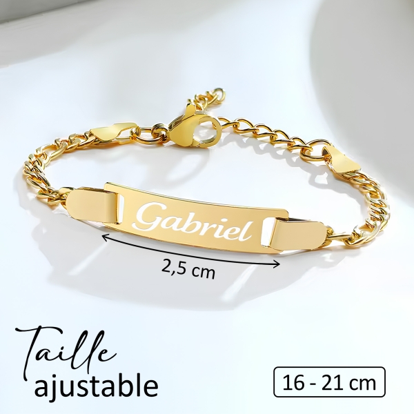 Offrez à votre enfant cette gourmette personnalisée. C'est un cadeau intemporel qui grandira avec lui et qui sera chéri pour les années à venir. Ce bracelet pour bébé et enfant est personnalisable avec le prénom, la date, le surnom de votre choix. La gourmette est réglable afin que votre enfant puisse continuer de la porter en grandissant.