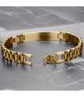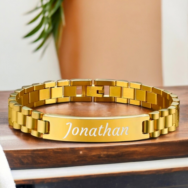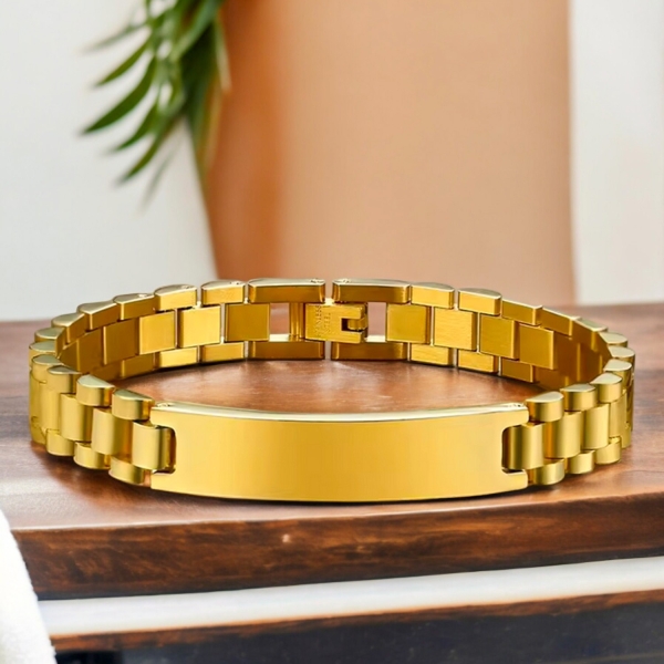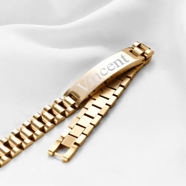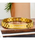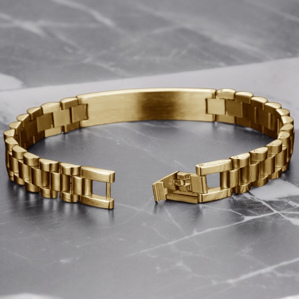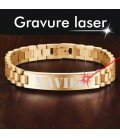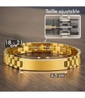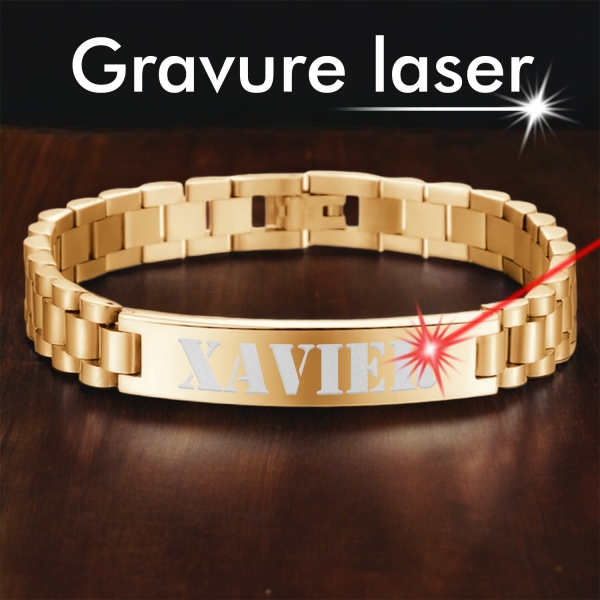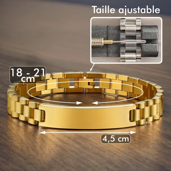 MATIÈRE : La plaque personnalisable du bracelet est en acier inoxydable dorée. L'avantage de l'acier inoxydable réside dans sa durabilité, sa résistance à la corrosion et sa facilité d'entretien.