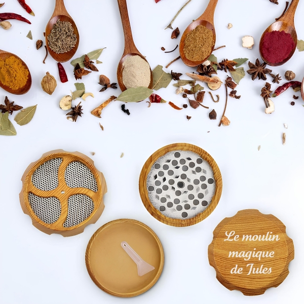 MATIÈRE : Le Grinder est en bois et en acier inoxydable, la spatule est en plastique.