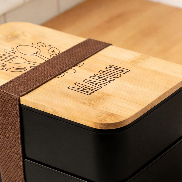 Personnalisez le couvercle en bambou de cette boite à repas. Nous gravons le texte de votre choix sur 3 lignes pour une bento unique. Cette Lunchbox dispose de deux compartiments et est fournie avec des couverts et un séparateur. Vous pouvez l'offrir à diverses occasions comme Noël, un anniversaire, la fête des pères et mères, etc.