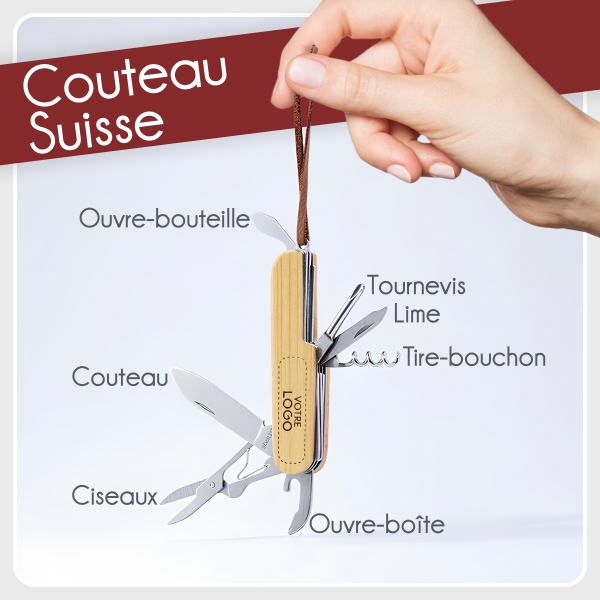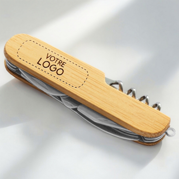 Couteau suisse en bambou personnalisable gravé avec votre logo. Il valorise votre marque et se transforme en cadeau utile et mémorable pour vos clients, collaborateurs et partenaires. Parfait pour les cadeaux d'affaires et de fin d'année.