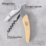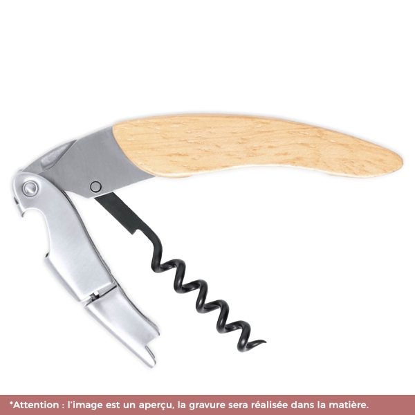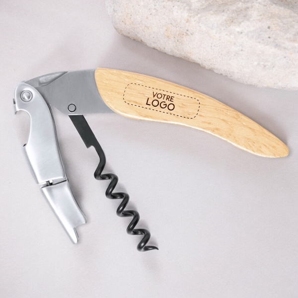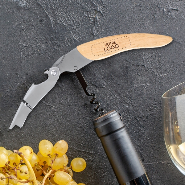 Tire-bouchon sommelier en bois personnalisable, gravé avec votre logo. Il présente 3 fonctions : tire-bouchon, décapsuleur et coupe-capsule. Parfait pour équiper vos équipes ou faire plaisir à vos clients avec un cadeau exclusif qui reflète votre image.