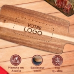 Planche apéro en bois d'acacia personnalisée, gravée avec votre logo. Idéale pour valoriser votre image et offrir une expérience unique. Parfaite comme cadeau d’affaires, objet de fidélisation ou support de communication élégant pour vos clients, partenaires et collaborateurs.