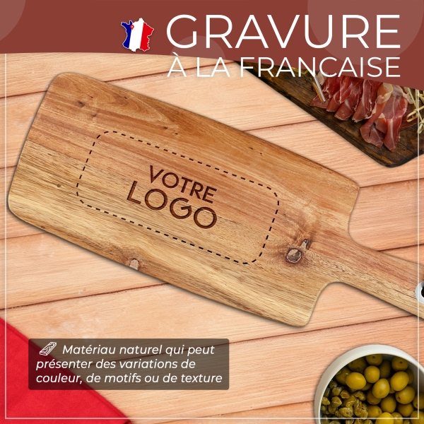 PERSONNALISATION : La planche apéro est personnalisable avec le logo de votre choix. Avec votre logo d'inscrit sur celle-ci, vous obtiendrez un cadeau unique et original. Nous réalisons votre cadeau personnalisé dans notre atelier en France !