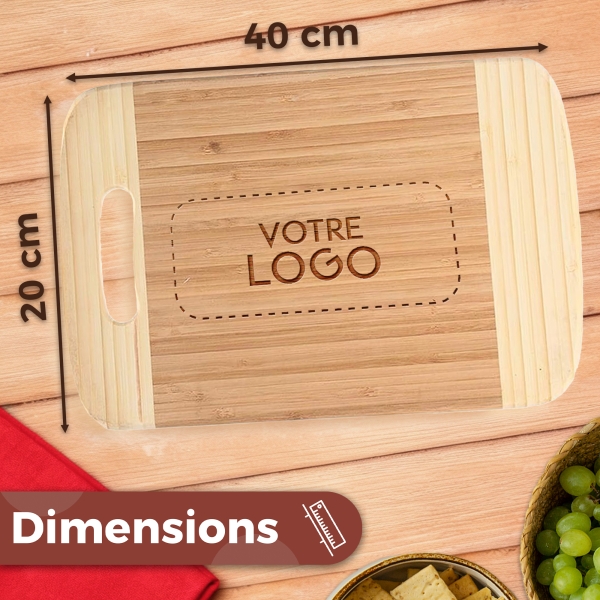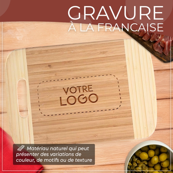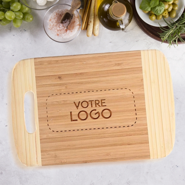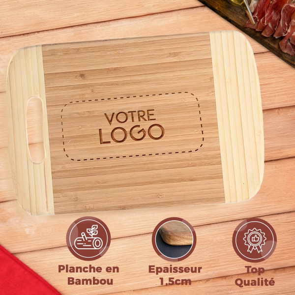 Planche à découper en bambou personnalisée avec votre logo, à la fois pratique et durable. Idéale pour offrir à vos clients, partenaires ou collaborateurs, pour valoriser votre marque au quotidien.