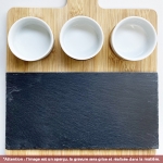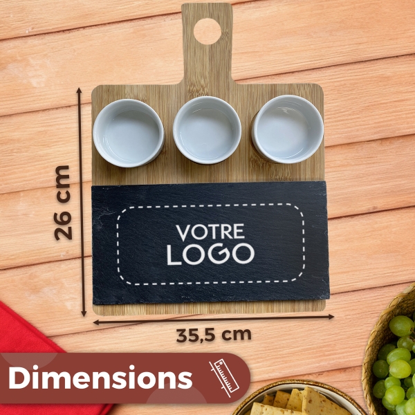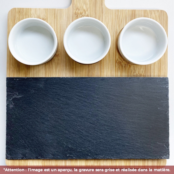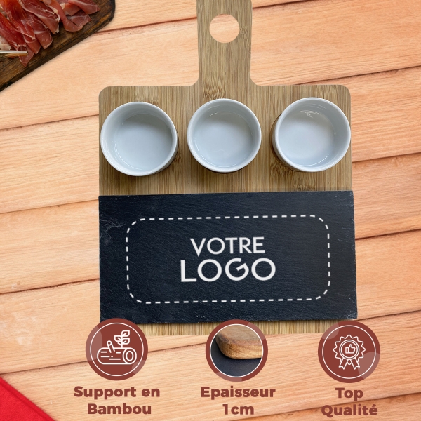 Plateau à tapas en bambou et ardoise à graver avec votre logo. Idéal pour servir vos tapas, saucisson et autres préparations apéritives. Composé d'un plateau en ardoise et de 3 soucoupes amovibles.
