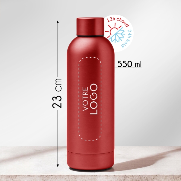 Gourde personnalisée avec votre logo, gravée au laser professionnel directement sur l'acier inoxydable. Réutilisable et personnalisable, elle est parfaite pour renforcer votre image et offrir un cadeau durable.