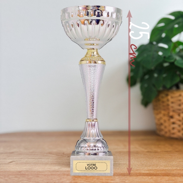 Parfaite pour les écoles, clubs ou entreprises, cette coupe argentée et dorée peut être personnalisée avec le logo de votre choix. Un trophée idéal pour célébrer une réussite sportive, récompenser un concours ou marquer un événement professionnel.