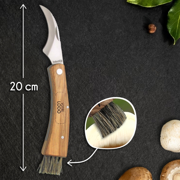 Couteau à champignon avec manche en bois personnalisable avec votre logo. Pratique et élégant, il est doté d’une lame en acier inoxydable et d’une brosse intégrée pour un nettoyage facile.