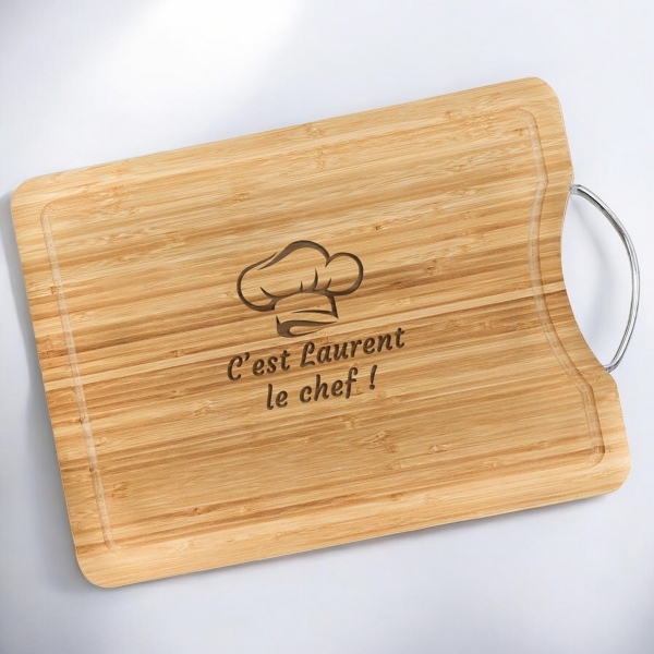 Cette grande planche à découper en bambou est à personnaliser avec le texte que vous souhaitez. Cette grande planche à découper en bois est un excellent cadeau à offrir à tous les cuisiniers dans l'âme ! Le bambou aux propriétés antibactériennes fera de cet objet pratique un cadeau à avoir absolument dans votre cuisine !