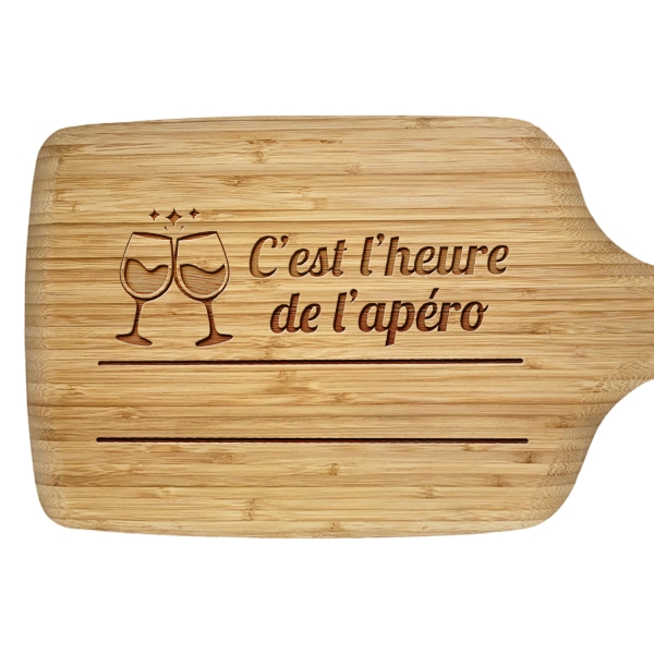 Une planche à découper personnalisée est un cadeau idéal pour les passionnés de cuisine. C’est un cadeau unique qui permet d’ajouter une touche personnelle à votre cuisine, ainsi qu’à vos présentations culinaires ! Ce modèle apéro vous propose 1 lignes de texte personnalisable.