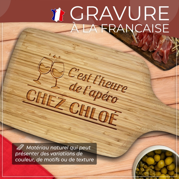 PERSONNALISATION : La planche apéritive est personnalisable avec le texte ou le prénom de votre choix. Avec votre prénom inscrit sur celle-ci, vous obtiendrez un cadeau unique et original pour un anniversaire. Nous réalisons votre cadeau personnalisé dans notre atelier en France en 24h !