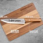 Offrez un couteau de chef personnalisable, pensé pour ceux qui aiment vraiment cuisiner. Sa lame de 20 cm en acier inoxydable assure une coupe précise et durable pour viandes, légumes ou herbes, tandis que son manche en bambou offre une prise en main confortable. La lame peut être gravée  avec un prénom avec ou sans logo. Un cadeau idéal pour un anniversaire, Noël, la fête des pères.