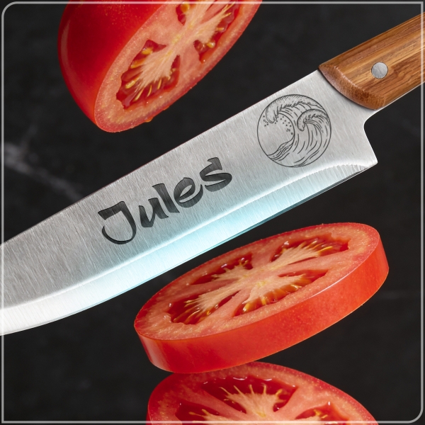 Ce couteau de chef personnalisé est conçu pour ceux qui aiment cuisiner avec de beaux outils. Élégant, précis et agréable à utiliser, il devient encore plus spécial grâce à une gravure personnalisée sur la lame. Un cadeau utile et unique pour un passionné de cuisine, un proche ou pour se faire plaisir.