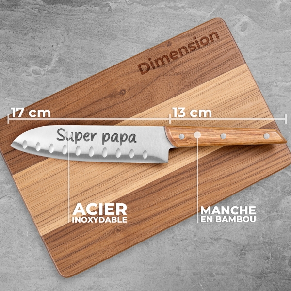 Offrez un couteau santoku personnalisable, pensé pour ceux qui aiment vraiment cuisiner. Sa lame de 17 cm en acier inoxydable assure une coupe précise et durable pour viandes, légumes ou herbes, tandis que son manche en bambou offre une prise en main confortable. La lame peut être gravée avec un prénom avec ou sans logo. Un cadeau idéal pour un anniversaire, Noël, la fête des pères.