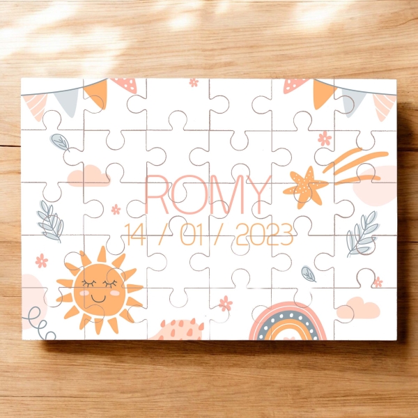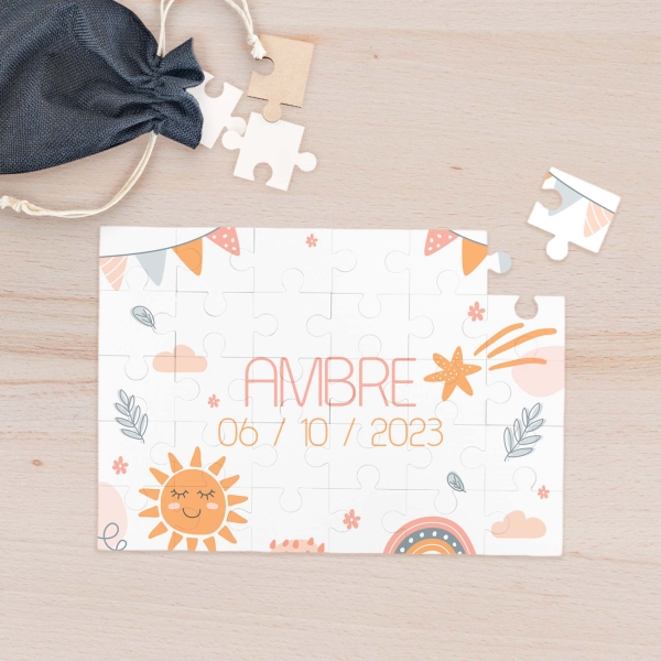 Personnalisez ce puzzle avec le prénom et la date de naissance de votre petite fille. Avec un fond spécialement conçu pour elle, ce puzzle ludique et éducatif est idéal pour s’amuser tout en créant un souvenir unique. Bien que le fond soit imposé pour un design harmonieux, le texte est entièrement personnalisable, offrant un cadeau à la fois divertissant et personnel !
