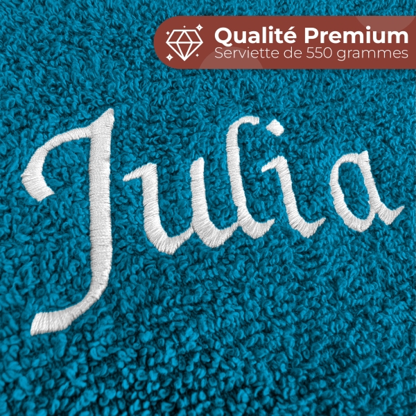 Serviette de bain de couleur Océan à personnaliser en broderie avec un prénom. Le moelleux va vous séduire dès votre première douche, vous ne pourrez plus vous en passer. Composé d'un liteau aux finitions très soignées. Un cadeau original à offrir pour différentes occasions comme la fête des mères, un mariage, un anniversaire ou encore la Saint-Valentin.