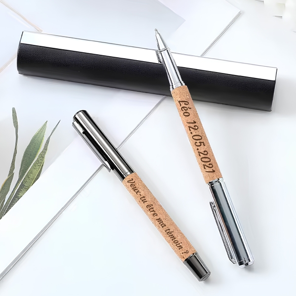 Offrez un stylo personnalisé en liège gravé au laser pour un cadeau unique et élégant, parfait pour toute occasion. Idéal pour célébrer une promotion, un anniversaire ou un mariage, ce stylo raffiné crée des souvenirs durables. De plus, il est fourni avec un joli coffret, idéal pour offrir.