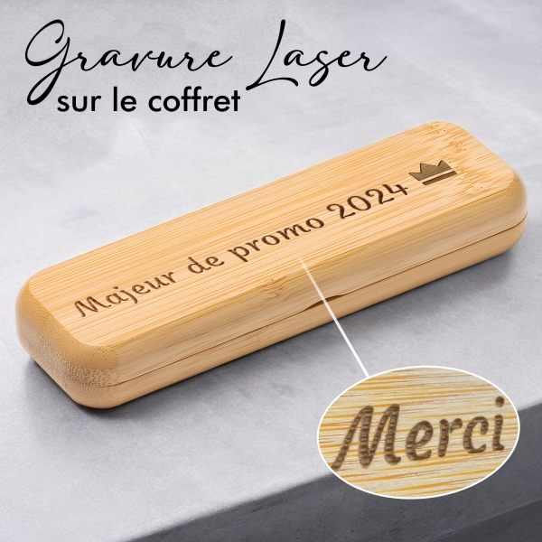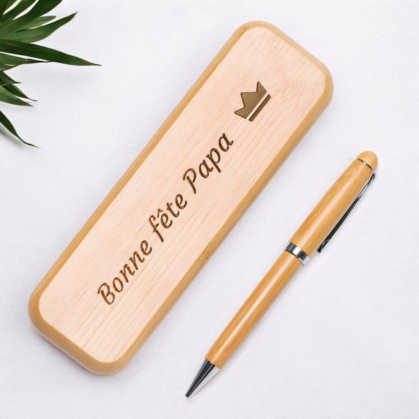 MATIÈRE : Le stylo est en bambou et en métal puis le coffret est en bois de bambou. Le bambou étant un matériau naturel, la teinte et les veinures de la gravure peuvent varier.