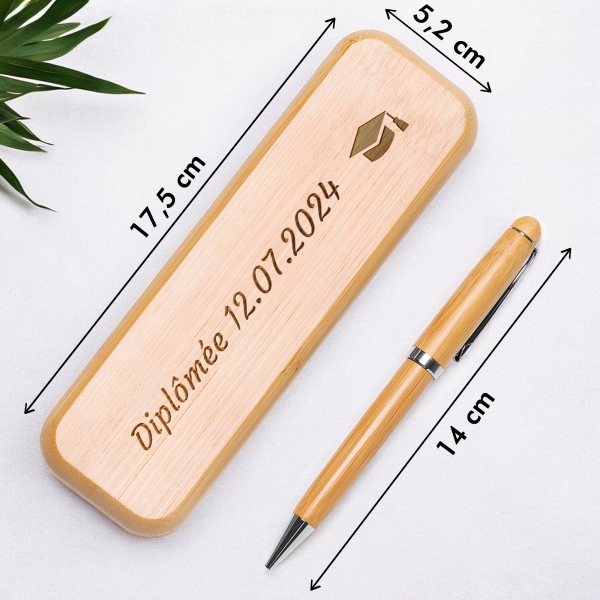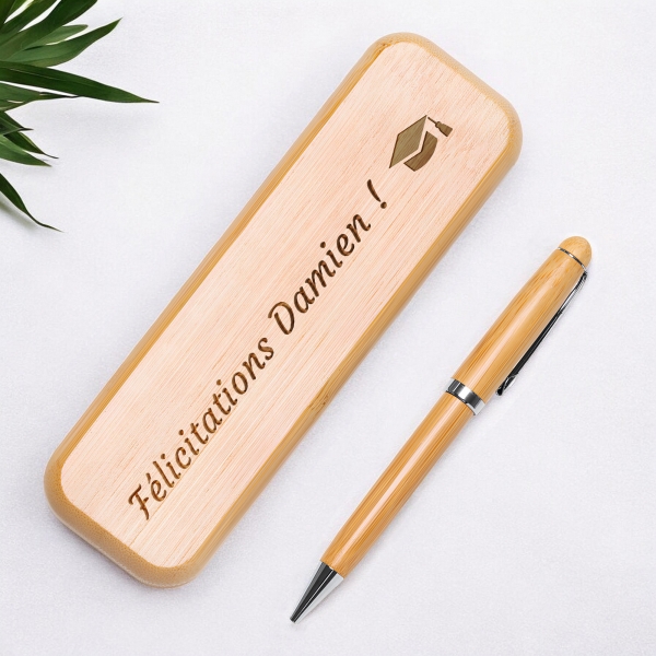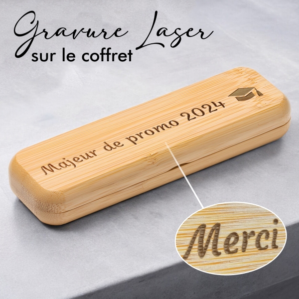 MATIÈRE : Le stylo est en bambou et en métal puis le coffret est en bois de bambou. Le bambou étant un matériau naturel, la teinte et les veinures de la gravure peuvent varier.