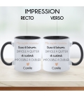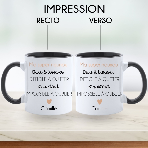 IMPRESSION : Votre personnalisation est imprimée au recto et au verso du mug. Réalisée avec la technique de sublimation, vous obtiendrez une impression en couleur de qualité qui ne bougera pas dans le temps. En effet, votre personnalisation est transférée directement sur la matière.