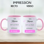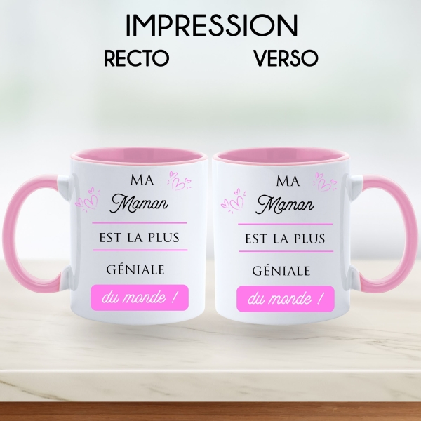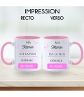 IMPRESSION : Votre personnalisation est imprimée au recto et au verso du mug. Réalisée avec la technique de sublimation, vous obtiendrez une impression en couleur de qualité qui ne bougera pas dans le temps. En effet, votre personnalisation est transférée directement sur la matière.