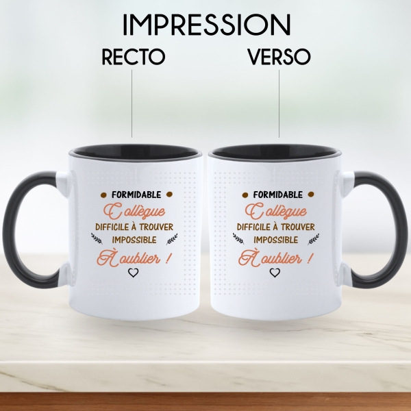 IMPRESSION : Votre personnalisation est imprimée au recto et au verso du mug. Réalisée avec la technique de sublimation, vous obtiendrez une impression en couleur de qualité qui ne bougera pas dans le temps. En effet, votre personnalisation est transférée directement sur la matière.