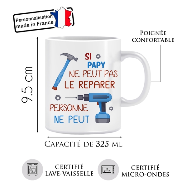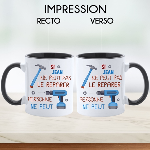Offrez une touche d'humour à votre bricoleur préféré avec notre tasse personnalisable : "Si [Prénom] ne peut pas le réparer, personne ne peut". Un cadeau unique à personnaliser avec le prénom de votre choix, idéal pour un anniversaire, la fête des pères ou toute autre occasion. Compatible lave-vaisselle et micro-ondes, cette tasse allie praticité et originalité !